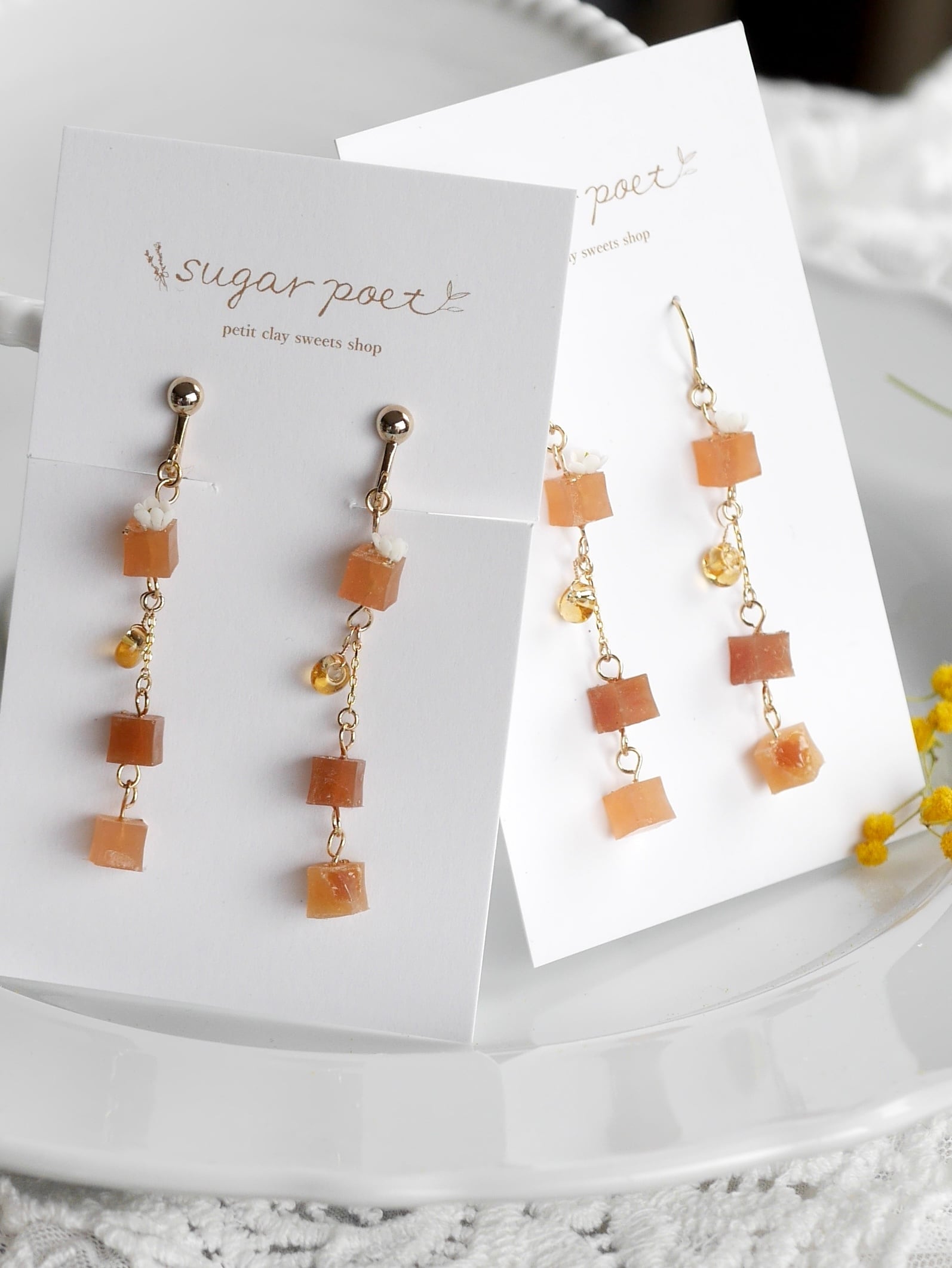 ほんのり透け感のあるキューブ型のキャラメルに、少し細かい金箔を散りばめて、透明感のあるアクセサリーにお仕立てしました*